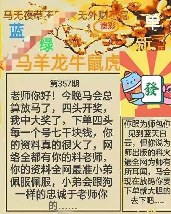 老师你好!今晚马会总算放马了,四头开奖,我中大奖了,下单四头每一个号七干块钱,你的资料真的很火了,网络全都有你的料老师,你的资料全网最准小弟佩服佩服,小弟会跟狗一样的忠诚于老师你的.…..