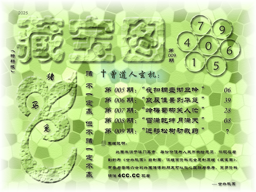 009期藏寶圖 新:近移松树初栽药 老:竹里风生月上门 禁: ...