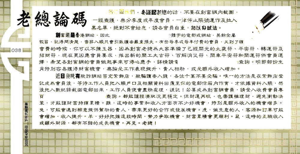 038期:六合皇金句/老总论码/萧公子/林大师/五行夺码/老总信箱截图
